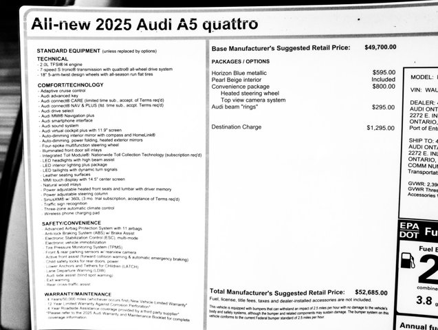 Dual Zone Front Automatic Air Conditioning, Bluetooth Wireless Phone Connectivity, Power Liftgate Rear Cargo Access, Back-Up Camera, Audi parking system plus Front And Rear Parking Sensors, Leatherette Door Trim Insert, Day-Night Auto-Dimming Rear view Mirror, Black Side Windows Trim and Black Front Windshield Trim, Valet Function, Trunk/Hatch Auto-Latch. This Audi A5 has a strong Intercooled Turbo Premium Unleaded I-4 2.0 L/121 engine powering this Automatic transmission.* Experience a Fully-Loaded Audi A5 Premium *Tailgate/Rear Door Lock Included w/ Power Door Locks, Speed Sensitive Rain Detecting Variable Intermittent Wipers w/ Heated Jets, Smart Device Integration, Side Impact Beams, Rear Child Safety Locks, Power Door Locks w/ Autolock Feature, Power 1st Row Windows w/ Front And Rear 1-Touch Up/Down, Perimeter/Approach Lights, Outside Temp Gauge, Outboard Front Lap And Shoulder Safety Belts w/ Rear Center 3 Point, Height Adjusters and Pretensioners, Multi-Link Rear Suspension w/ Coil Springs, LED Brakelights, Leather Seating Surfaces, Gas-Pressurized Shock Absorbers, Galvanized Steel/Aluminum Panels, Full Cloth Headliner, Front Fog Lamps, Front and Rear Anti-Roll Bars, Fixed Rear Window w/ Defroster, Fade-To-Off Interior Lighting.* Visit Us Today *For a must-own Audi A5 come see us at Audi Ontario, 2272 E. Inland Empire Blvd, Ontario, CA 91764. Just minutes away!