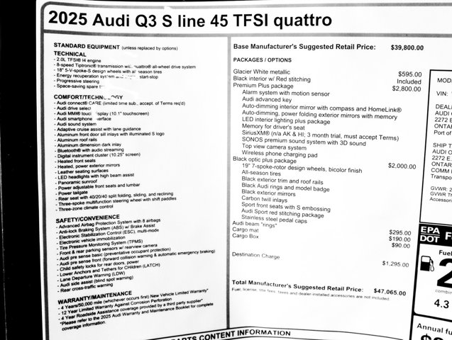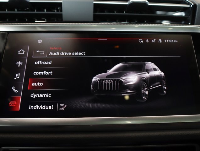 Dual Zone Front Automatic Air Conditioning, Power Liftgate Rear Cargo Access, Remote Keyless Entry w/Integrated Key Transmitter, 4 Door Curb/Courtesy, Illuminated Entry and Panic Button, Audi parking system plus Front And Rear Parking Sensors, Valet Function, Trunk/Hatch Auto-Latch, Tailgate/Rear Door Lock Included w/ Power Door Locks, Strut Front Suspension w/ Coil Springs, Smart Device Integration, Side Impact Beams. This Audi Q3 has a strong Intercooled Turbo Regular Unleaded I-4 2.0 L/121 engine powering this Automatic transmission.* Experience a Fully-Loaded Audi Q3 45 S line Premium Plus *Rain Detecting Variable Intermittent Wipers w/ Heated Jets, Power Door Locks w/ Autolock Feature, Power 1st Row Windows w/ Front And Rear 1-Touch Up/Down, Perimeter/Approach Lights, Outside Temp Gauge, Outboard Front Lap And Shoulder Safety Belts w/ Rear Center 3 Point, Height Adjusters and Pretensioners, Multi-Link Rear Suspension w/ Coil Springs, Manual w/ Tilt Front Head Restraints and Manual Adjustable Rear Head Restraints, Manual Tilt/Telescoping Steering Column, Lip Spoiler, LED Brakelights, Leather Steering Wheel, Leather Seating Surfaces, Interior Trim w/ Metal-Look Instrument Panel Insert, Metal-Look Door Panel Insert, Metal-Look Console Insert and Metal-Look Interior Accents, Gas-Pressurized Shock Absorbers, Galvanized Steel/Aluminum Panels, Full Cloth Headliner, Front And Rear Fog Lamps, Front and Rear Anti-Roll Bars, Fade-To-Off Interior Lighting.* Stop By Today *Come in for a quick visit at Audi Ontario, 2272 E. Inland Empire Blvd, Ontario, CA 91764 to claim your Audi Q3!