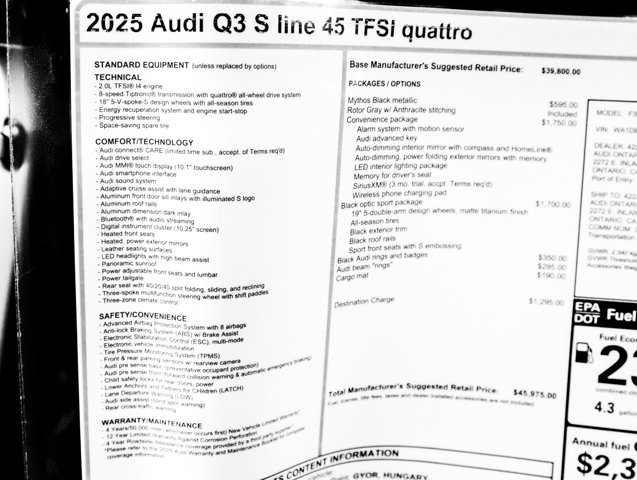 Dual Zone Front Automatic Air Conditioning, Power Liftgate Rear Cargo Access, Back-Up Camera, Remote Keyless Entry w/Integrated Key Transmitter, 4 Door Curb/Courtesy, Illuminated Entry and Panic Button, Audi parking system plus Front And Rear Parking Sensors, Valet Function, Trunk/Hatch Auto-Latch, Tailgate/Rear Door Lock Included w/ Power Door Locks, Strut Front Suspension w/ Coil Springs, Smart Device Integration. This Audi Q3 has a strong Intercooled Turbo Regular Unleaded I-4 2.0 L/121 engine powering this Automatic transmission.*These Packages Will Make Your Audi Q3 45 S line Premium The Envy of Your Friends *Side Impact Beams, Rain Detecting Variable Intermittent Wipers w/ Heated Jets, Power Door Locks w/ Autolock Feature, Power 1st Row Windows w/ Front And Rear 1-Touch Up/Down, Perimeter/Approach Lights, Outside Temp Gauge, Outboard Front Lap And Shoulder Safety Belts w/ Rear Center 3 Point, Height Adjusters and Pretensioners, Multi-Link Rear Suspension w/ Coil Springs, Manual w/ Tilt Front Head Restraints and Manual Adjustable Rear Head Restraints, Manual Tilt/Telescoping Steering Column, Lip Spoiler, LED Brakelights, Leather Steering Wheel, Leather Seating Surfaces, Interior Trim w/ Metal-Look Instrument Panel Insert, Metal-Look Door Panel Insert, Metal-Look Console Insert and Metal-Look Interior Accents, Gas-Pressurized Shock Absorbers, Galvanized Steel/Aluminum Panels, Full Cloth Headliner, Front And Rear Fog Lamps, Front and Rear Anti-Roll Bars.* Stop By Today *A short visit to Audi Ontario located at 2272 E. Inland Empire Blvd, Ontario, CA 91764 can get you a trustworthy Q3 today!