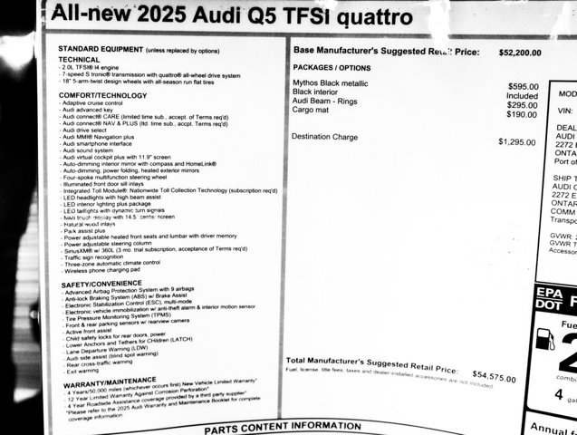 Dual Zone Front Automatic Air Conditioning, Power Liftgate Rear Cargo Access, Back-Up Camera, 8-Way Driver Seat, Audi parking system plus Front And Rear Parking Sensors, Leatherette Door Trim Insert, Day-Night Auto-Dimming Rear view Mirror, Valet Function, Trunk/Hatch Auto-Latch, Tailgate/Rear Door Lock Included w/ Power Door Locks. This Audi Q5 has a powerful Intercooled Turbo Premium Unleaded I-4 2.0 L/121 engine powering this Automatic transmission.*This Audi Q5 Premium Has Everything You Want *Speed Sensitive Rain Detecting Variable Intermittent Wipers w/ Heated Jets, Smart Device Integration, Side Impact Beams, Roof Rack, Power Door Locks w/ Autolock Feature, Power 1st Row Windows w/ Front And Rear 1-Touch Up/Down, Perimeter/Approach Lights, Outside Temp Gauge, Outboard Front Lap And Shoulder Safety Belts w/ Rear Center 3 Point, Height Adjusters and Pretensioners, Multi-Link Rear Suspension w/ Coil Springs, Manual w/ Tilt Front Head Restraints and Manual Adjustable Rear Head Restraints, Lip Spoiler, LED Brakelights, Leather Steering Wheel w/ Auto Tilt-Away, Leather Seating Surfaces, Gas-Pressurized Shock Absorbers, Galvanized Steel/Aluminum Panels, Full Cloth Headliner, Front And Rear Fog Lamps, Front and Rear Anti-Roll Bars.* Stop By Today *A short visit to Audi Ontario located at 2272 E. Inland Empire Blvd, Ontario, CA 91764 can get you a dependable Q5 today!