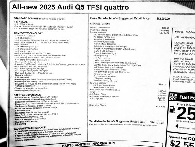 Dual Zone Front Automatic Air Conditioning, Power Liftgate Rear Cargo Access, Audi parking system plus Front And Rear Parking Sensors, Leatherette Door Trim Insert, Day-Night Auto-Dimming Rear view Mirror, Valet Function, Trunk/Hatch Auto-Latch, Tailgate/Rear Door Lock Included w/ Power Door Locks, Speed Sensitive Rain Detecting Variable Intermittent Wipers w/ Heated Jets, Smart Device Integration. This Audi Q5 has a powerful Intercooled Turbo Premium Unleaded I-4 2.0 L/121 engine powering this Automatic transmission.* Experience a Fully-Loaded Audi Q5 Prestige *Side Impact Beams, Roof Rack, Power Door Locks w/ Autolock Feature, Power 1st Row Windows w/ Front And Rear 1-Touch Up/Down, Perimeter/Approach Lights, Outside Temp Gauge, Outboard Front Lap And Shoulder Safety Belts w/ Rear Center 3 Point, Height Adjusters and Pretensioners, Manual w/ Tilt Front Head Restraints and Manual Adjustable Rear Head Restraints, Lip Spoiler, Leather Steering Wheel w/ Auto Tilt-Away, Leather Seating Surfaces, Gas-Pressurized Shock Absorbers, Galvanized Steel/Aluminum Panels, Full Cloth Headliner, Front And Rear Fog Lamps, Front and Rear Anti-Roll Bars, Fade-To-Off Interior Lighting, Engine Auto Stop-Start Feature, Electronic Stability Control (ESC), Dual Stage Driver and Passenger Seat-Mounted Side Airbags.* Visit Us Today *For a must-own Audi Q5 come see us at Audi Ontario, 2272 E. Inland Empire Blvd, Ontario, CA 91764. Just minutes away!