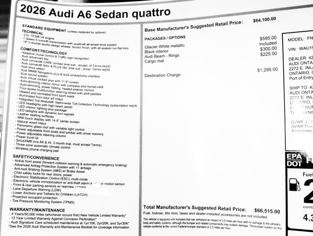Power Liftgate Rear Cargo Access, Back-Up Camera, Remote Keyless Entry w/Integrated Key Transmitter, 4 Door Curb/Courtesy, Illuminated Entry and Panic Button, Audi parking system plus Front And Rear Parking Sensors, Leatherette Door Trim Insert, Day-Night Auto-Dimming Rear view Mirror, Valet Function, Trunk/Hatch Auto-Latch, Speed Sensitive Rain Detecting Variable Intermittent Wipers w/ Heated Jets, Smart Device Integration. This Audi A6 has a powerful Intercooled Turbo Premium Unleaded V-6 3.0 L/183 engine powering this Automatic transmission.*These Packages Will Make Your Audi A6 Premium The Envy of Your Friends *Side Impact Beams, Regenerative 4-Wheel Disc Brakes w/ 4-Wheel ABS, Front and Rear Vented Discs, Brake Assist, Hill Hold Control and Electric Parking Brake, Power Door Locks w/ Autolock Feature, Power 1st Row Windows w/ Front And Rear 1-Touch Up/Down, Perimeter/Approach Lights, Outside Temp Gauge, Outboard Front Lap And Shoulder Safety Belts w/ Rear Center 3 Point, Height Adjusters and Pretensioners, Multi-Link Rear Suspension w/ Coil Springs, LED Brakelights, Leather Steering Wheel w/ Auto Tilt-Away, Leather Seating Surfaces, Gas-Pressurized Shock Absorbers, Galvanized Steel/Aluminum Panels, Full Cloth Headliner, Front and Rear Anti-Roll Bars, Fixed Rear Window w/ Defroster, Fixed Front Head Restraints and Manual Adjustable Rear Head Restraints, Fade-To-Off Interior Lighting, Engine Auto Stop-Start Feature, Electronic Stability Control (ESC).* Stop By Today *Come in for a quick visit at Audi Ontario, 2272 E. Inland Empire Blvd, Ontario, CA 91764 to claim your Audi A6!