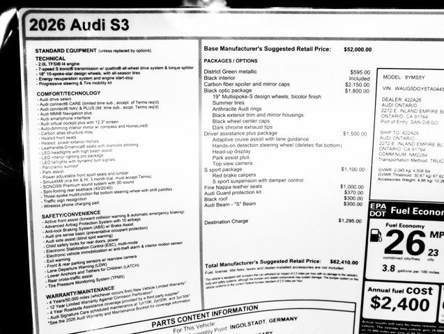 Dual Zone Front Automatic Air Conditioning, Bluetooth Wireless Phone Connectivity, Back-Up Camera, Remote Keyless Entry w/Integrated Key Transmitter, Illuminated Entry and Panic Button, Sport Tuned Suspension, Leatherette Door Trim Insert, Day-Night Auto-Dimming Rear view Mirror, Valet Function, Trunk/Hatch Auto-Latch, Strut Front Suspension w/ Coil Springs. This Audi S3 has a dependable Intercooled Turbo Premium Unleaded I-4 2.0 L/121 engine powering this Automatic transmission.* Experience a Fully-Loaded Audi S3 *Sport Leather Steering Wheel, Speed Sensitive Rain Detecting Variable Intermittent Wipers w/ Heated Jets, Smart Device Integration, Side Impact Beams, Rear Fog Lamps, Power Door Locks w/ Autolock Feature, Power 1st Row Windows w/ Front And Rear 1-Touch Up/Down, Perimeter/Approach Lights, Outside Temp Gauge, Outboard Front Lap And Shoulder Safety Belts w/ Rear Center 3 Point, Height Adjusters and Pretensioners, Multi-Link Rear Suspension w/ Coil Springs, Manual Tilt/Telescoping Steering Column, Lip Spoiler, LED Brakelights, Gas-Pressurized Shock Absorbers, Galvanized Steel/Aluminum Panels, Full Cloth Headliner, Front and Rear Anti-Roll Bars, Fixed Rear Window w/ Defroster, Fixed Front Head Restraints and Manual Adjustable Rear Head Restraints.* Visit Us Today *Come in for a quick visit at Audi Ontario, 2272 E. Inland Empire Blvd, Ontario, CA 91764 to claim your Audi S3!