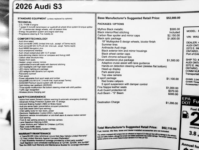 Dual Zone Front Automatic Air Conditioning, Bluetooth Wireless Phone Connectivity, Back-Up Camera, Remote Keyless Entry w/Integrated Key Transmitter, Illuminated Entry and Panic Button, Sport Tuned Suspension, Leatherette Door Trim Insert, Day-Night Auto-Dimming Rear view Mirror, Valet Function, Trunk/Hatch Auto-Latch, Strut Front Suspension w/ Coil Springs. This Audi S3 has a dependable Intercooled Turbo Premium Unleaded I-4 2.0 L/121 engine powering this Automatic transmission.*These Packages Will Make Your Audi S3 The Envy of Your Friends *Sport Leather Steering Wheel, Speed Sensitive Rain Detecting Variable Intermittent Wipers w/ Heated Jets, Smart Device Integration, Side Impact Beams, Rear Fog Lamps, Power Door Locks w/ Autolock Feature, Power 1st Row Windows w/ Front And Rear 1-Touch Up/Down, Perimeter/Approach Lights, Outside Temp Gauge, Outboard Front Lap And Shoulder Safety Belts w/ Rear Center 3 Point, Height Adjusters and Pretensioners, Multi-Link Rear Suspension w/ Coil Springs, Manual Tilt/Telescoping Steering Column, Lip Spoiler, LED Brakelights, Gas-Pressurized Shock Absorbers, Galvanized Steel/Aluminum Panels, Full Cloth Headliner, Front and Rear Anti-Roll Bars, Fixed Rear Window w/ Defroster, Fixed Front Head Restraints and Manual Adjustable Rear Head Restraints.* Visit Us Today *Come in for a quick visit at Audi Ontario, 2272 E. Inland Empire Blvd, Ontario, CA 91764 to claim your Audi S3!