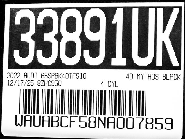 AUDI ONTARIO, ONE OWNER, CONVENIENCE PACKAGE, SEASON OF AUDI SALES EVENT!!!, Alarm System w/Motion Sensors, Audi Advanced Key, Audi Side Assist w/Pre Sense Rear, Auto High-beam Headlights, Auto-Dimming Exterior Mirrors w/Memory, Auto-dimming Rear-View mirror, Convenience Package, Driver Seat Memory, Exterior Parking Camera Rear, Front dual zone A/C, Front fog lights, Garage door transmitter: HomeLink, Heated Front Seats, Heated Steering Wheel, Leather Seating Surfaces, Parking System Plus (Front/Rear Acoustic Sensors), Power Liftgate, Power moonroof, Rain sensing wipers, SiriusXM All Access Service, Turn signal indicator mirrors, Wheels: 18 5-V-Spoke-Y Design. quattro A5 Sportback Clean CARFAX. Mythos Black Metallic 2022 Audi Premium quattro 7-Speed Automatic S tronic 2.0L 4-Cylinder TFSIRecent Arrival! Priced below KBB Fair Purchase Price! 26/34 City/Highway MPG