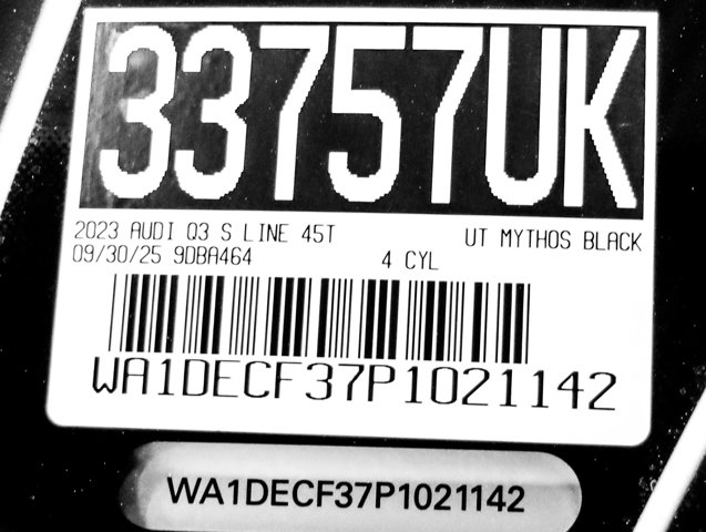 SUMMER SALES CLEARANCE EVENT!, AUDI ONTARIO, ONE OWNER, S LINE PACKAGE, Alarm w/Motion Sensor, Audi Advanced Key, Audi smartphone interface (Apple CarPlay/Android Auto), Auto-Dimming Power-Folding Exterior Mirrors, Convenience Package, Driver Seat Memory, Exterior Parking Camera Rear, Front dual zone A/C, Front fog lights, Heated door mirrors, Heated Front Bucket Seats, Leather Seating Surfaces, LED Interior Lighting Package, Power Liftgate, Power moonroof: Panoramic, Rain sensing wipers, SiriusXM w/360L, Wheels: 18 5-V-Spoke-S Design. S Line quattro Q3 Clean CARFAX. Mythos Black Metallic 2023 Audi Premium quattro 8-Speed Automatic with Tiptronic 2.0L 4-Cylinder TFSIRecent Arrival! 21/28 City/Highway MPG