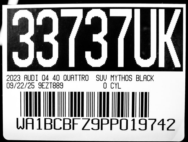 SUMMER SALES CLEARANCE EVENT!, AUDI ONTARIO, ONE OWNER, PREMIUM PLUS, NAVIGATION, SONOS PREMIUM SOUND, Adaptive Cruise Assist w/Lane Guidance, Alarm System w/Motion Sensor, Audi Beam-Rings, Audi Connect PLUS, Audi MMI Navigation Plus, Audi Virtual Cockpit Plus, Auto-Dimming Interior Mirror w/Compass, Auto-Dimming Power Folding Exterior Mirrors, Convenience Package, Dual-Pane Acoustic Glass for Front Side Windows, Exterior Parking Camera Rear, Front dual zone A/C, Hands-Free Power Tailgate, Heated Front Seats, Heated Steering Wheel, Leather Seating Surfaces, LED Interior Lighting Plus Package, Memory for Driver's Seat, Park Assist Plus, Power Front Passenger Seat, Power Liftgate, Power moonroof: Panoramic, Premium Plus, Projection Light in Exterior Mirrors, SiriusXM w/360L, SONOS Premium Sound System, Traffic Sign Recognition, Wheels: 19 5-W-Spoke Aero Design, Wireless Phone Charging Pad. Q4 e-tron Mythos Black Metallic 2023 Audi Premium Plus RWD Single-Speed Automatic Electric MotorRecent Arrival! Odometer is 3490 miles below market average! 112/94 City/Highway MPG