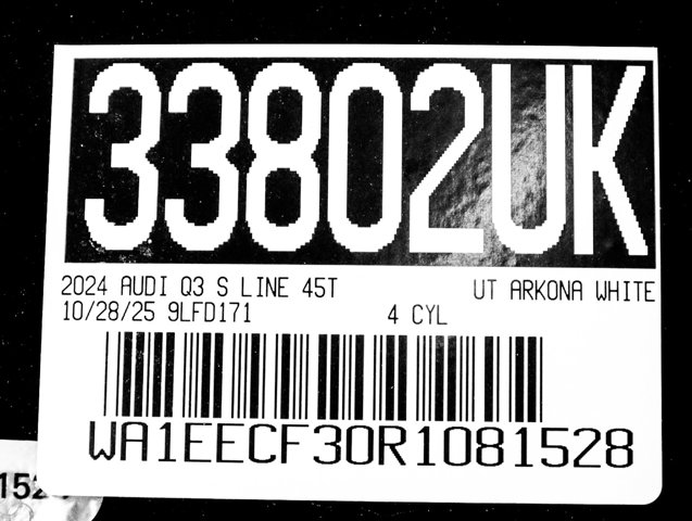 CERTIFIED PRE-OWNED!!, SUMMER SALES CLEARANCE EVENT!, AUDI ONTARIO, ONE OWNER, PREMIUM PLUS, 19 Wheel Package, Alarm w/Motion Sensor, Audi Beam-Rings, Audi smartphone interface (Apple CarPlay/Android Auto), Auto-Dimming Power-Folding Exterior Mirrors, Auto-Dimming Rear-View Mirror, Convenience Package, Driver Seat Memory, Exterior Parking Camera Rear, Front fog lights, Garage Door Opener (HomeLink), Heated Front Bucket Seats, Leather Seating Surfaces, LED Interior Lighting Package, LED Interior Lighting Plus Package, Power Liftgate, Power moonroof: Panoramic, Premium Plus Package, Rain sensing wipers, SiriusXM, Steering wheel mounted audio controls, Top View Camera System, Trailer Hitch, Wheels: 19 5-Double-Spoke Dynamic Design, Wireless Phone Charging Pad. S Line quattro Q3 Clean CARFAX. Certified. Arkona White 2024 Audi Premium Plus quattro 8-Speed Automatic with Tiptronic 2.0L 4-Cylinder TFSIRecent Arrival! 20/28 City/Highway MPGAudi Certified pre-owned Details:* Certified pre-owned Limited Warranty: For all CPO sales on or after 8/1/23, if New Vehicle Limited Warranty (NVLW) coverage remains at time of CPO purchase, CPO Limited Warranty Coverage commences upon expiration of NVLW and continues for a period of 1 year or 20,000 miles, whichever occurs first. If NVLW coverage has expired at time of CPO purchase, CPO Limited Warranty coverage commences at time of purchase and continues for 1 year or 20,000 miles, whichever occurs first. Roadside Assistance for 1 year with unlimited miles, whichever occurs first. Effective 8/1/23 onward, private party transfers no longer accepted, eligible for previous CPO customers with sale dates prior to 8/1/23 to utilize if they so choose.* Roadside Assistance* Vehicle History* Warranty Deductible: $0* 125+ Point Inspection