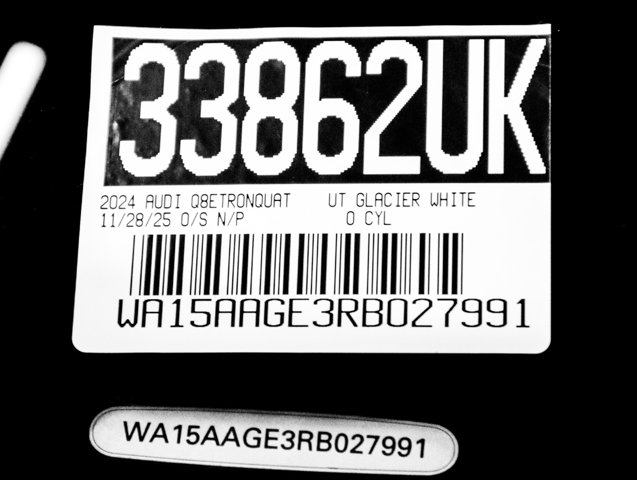 AUDI ONTARIO, ONE OWNER, PREMIUM PLUS PACKAGE, SEASON OF AUDI SALES EVENT!!!, Animation for Headlights & Taillights, Auto High-beam Headlights, Bang & Olufsen Sound System w/3D Sound, Dual Pane Acoustic Glass for Side Door Windows, Exterior Parking Camera Rear, Front Passenger Power Lumbar, Garage door transmitter: HomeLink, Heated 8-Way Power Front Seats, Heated Rear Seats, Heated steering wheel, Illuminated Front & Rear Aluminum Door Sill Inlays, Leather Seating Surfaces, LED Interior Lighting Package, Matrix-Design LED Headlights, Navigation system: MMI Navigation plus, Power Liftgate, Power moonroof: Panoramic, Premium Plus Package, Steering wheel memory, Steering wheel mounted audio controls, Top View Camera System, Traffic Sign Recognition, Trailer Hitch, Turn signal indicator mirrors, Ventilated Front Seats, Wheels: 20 5-Arm Aero Ring Design, Wireless Phone Charging Pad. quattro Q8 e-tron New Price! Glacier White Metallic 2024 Audi Premium Plus quattro Single-Speed Automatic Electric ZEVRecent Arrival! Odometer is 2374 miles below market average! 84/90 City/Highway MPG