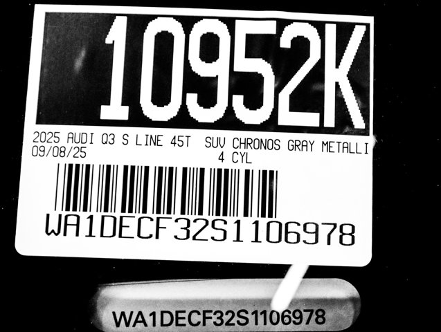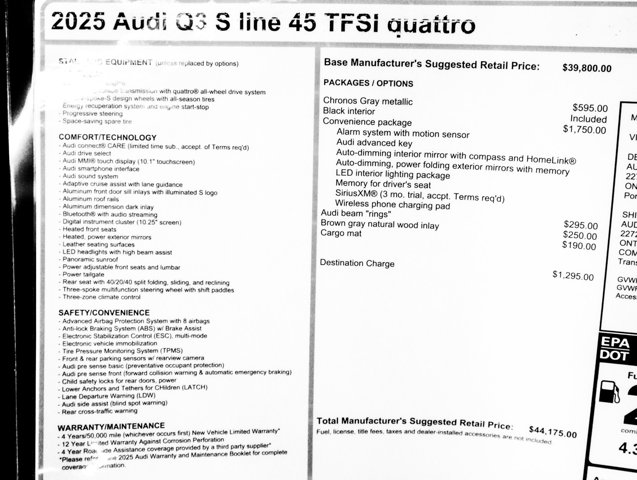 CERTIFIED PRE-OWNED!!, PRESIDENTS DAY SALE, AUDI ONTARIO, ONE OWNER, S LINE PACKAGE, CONVENIENCE PACKAGE, Alarm with Motion Sensor, Audi Advanced Key, Audi smartphone interface (Apple CarPlay/Android Auto), Auto High-beam Headlights, Auto-Dimming Power-Folding Exterior Mirrors, Auto-Dimming Rear-View Mirror, Convenience Package, Driver Seat Memory, Exterior Parking Camera Rear, Front fog lights, Garage Door Opener (HomeLink), Heated Front Bucket Seats, Leather Seating Surfaces, LED Interior Lighting Package, Power Liftgate, Power moonroof: Panoramic, Rain sensing wipers, SiriusXM with 360L (3 Months Trial), Steering wheel mounted audio controls, Wheels: 18 5-V-Spoke-S Design, Wireless Phone Charging Pad. S Line quattro Q3 Clean CARFAX. Certified. Chronos Gray Metallic 2025 Audi Premium quattro 8-Speed Automatic with Tiptronic 2.0L 4-Cylinder TFSIRecent Arrival! 20/28 City/Highway MPGAudi Certified pre-owned Details:* Certified pre-owned Limited Warranty: For all CPO sales on or after 8/1/23, if New Vehicle Limited Warranty (NVLW) coverage remains at time of CPO purchase, CPO Limited Warranty Coverage commences upon expiration of NVLW and continues for a period of 1 year or 20,000 miles, whichever occurs first. If NVLW coverage has expired at time of CPO purchase, CPO Limited Warranty coverage commences at time of purchase and continues for 1 year or 20,000 miles, whichever occurs first. Roadside Assistance for 1 year with unlimited miles, whichever occurs first. Effective 8/1/23 onward, private party transfers no longer accepted, eligible for previous CPO customers with sale dates prior to 8/1/23 to utilize if they so choose.* Roadside Assistance* Vehicle History* Warranty Deductible: $0* 125+ Point Inspection